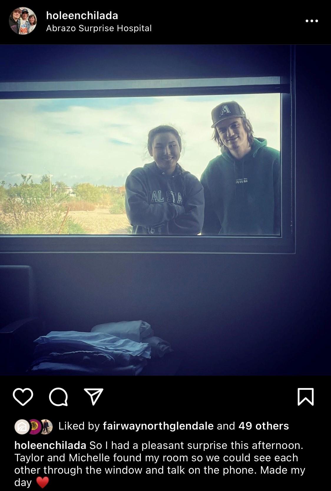 My Jackson Hole, Wyoming friends took the window visit a step further as they went to St John’s Hospital in Jackson and had a picture taken of them bundled up on the outside through a hospital window. I was crying multiple times daily, but the sight of this brought me deeper tears than any time yet.